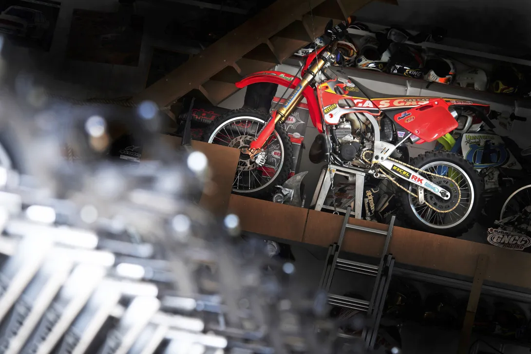 Korkealta hyllyltä maailmaa katsova Gas Gas ei ole ihan mikä tahansa enduropyörä. Se on käsintehty uniikkikappale, jolla Silvan voitti ensimmäisenä suomalaiskuljettajana tuplamestaruuden; luokkamestaruuden ohella myös kokonaiskilpailun maailmanmestaruuden.