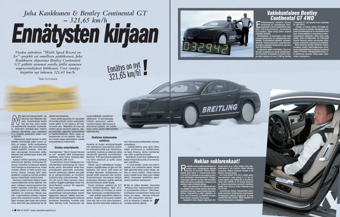 Vuoden mittainen World Speed Record on Ice -projekti sai onnellisen päätöksensä. Juha Kankkusen ohjastama Bentley Continental GT päihitti aiemmat autolla jäällä ajamisen nopeusennätykset kirkkaasti. Uusi ennätys kirjattiin nyt lukemin 321,65 km/h.