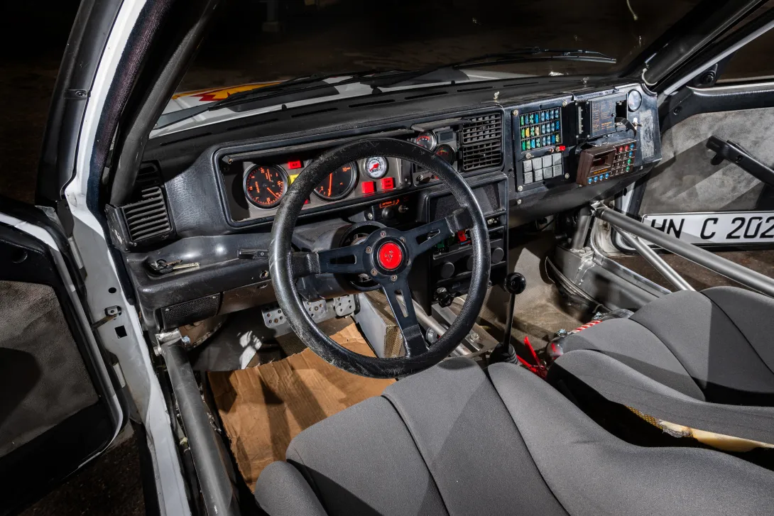 A-ryhmän alkukaudelle tyypillinen ralliohjaamo, jossa vakioauton ovipaneelit tuli säilyttää alkuperäisinä.