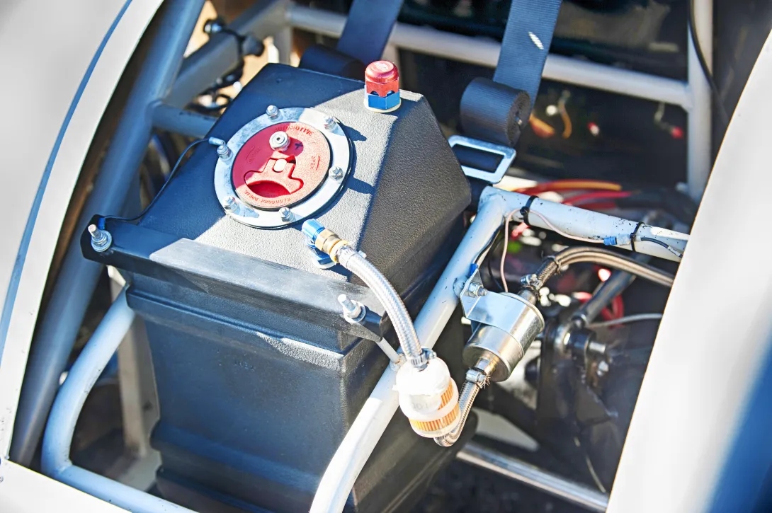 Takaluukun alta löytyvät turvatankki ja akku. Kaikkien asennuspaikat ovat tarkasti määritellyt, eikä kiinnityspisteiden paikkaa saa muuttaa. Painopistettä pystyy muuttamaan ainoastaan auton korkeudella pelaamalla.