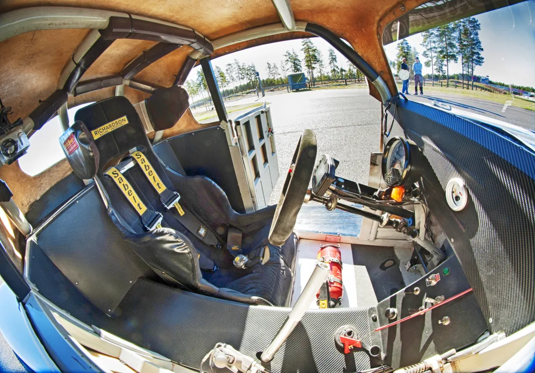 – Ei auton pienuus mitenkään ajamista haittaa, vaikka ohjaamossa onkin ahdasta. Kabiini on tajuttoman pieni, mutta ei sitä enää ajaessa suuremmin tiedosta, Grönholm elämöi istuessaan ohjaamossa lähes asvaltin tasolla.