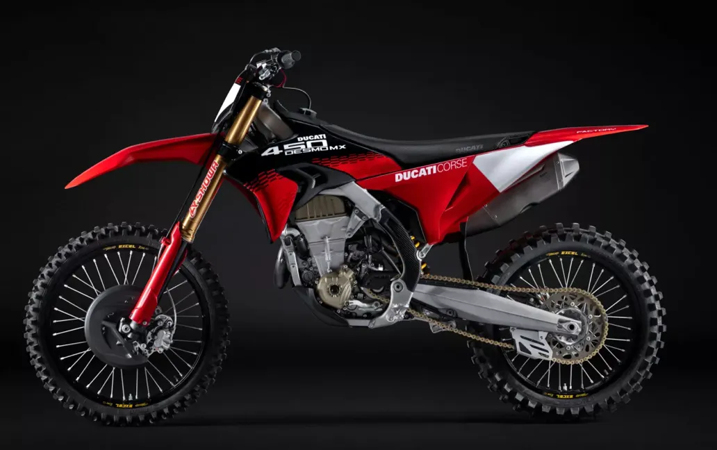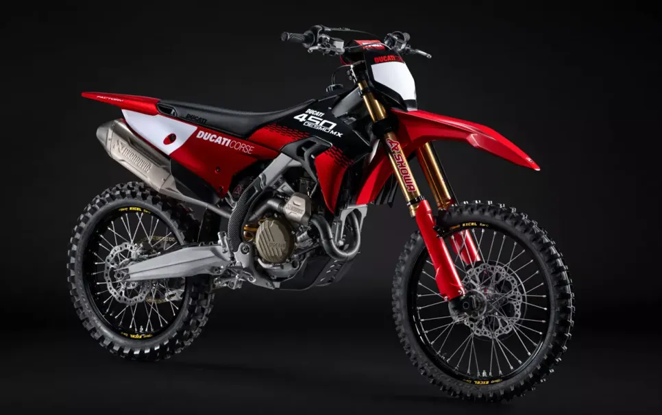 Desmo450 MX Factory on jo saatavilla valikoiduilla Ducati-jälleenmyyjillä Ducati Corse 2025 -värityksessä.