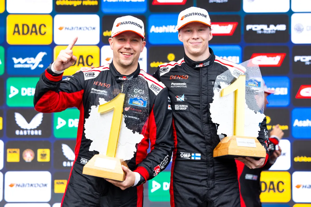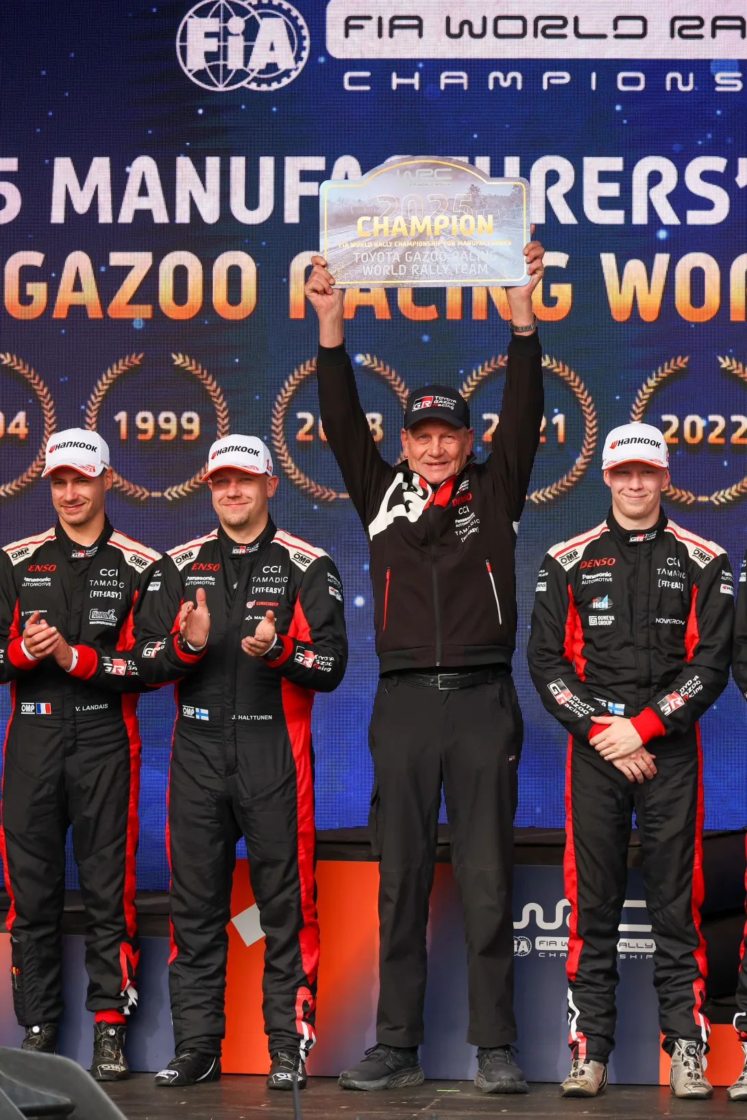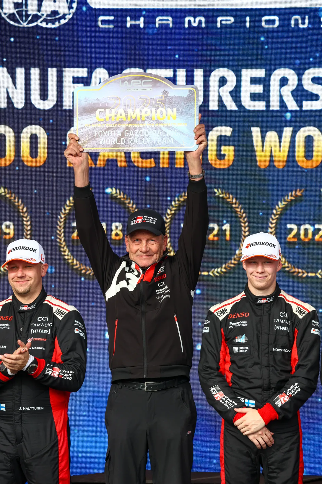Juha Kankkunen ja Keski-Euroopan rallin voittajat. Kalle Rovanperä ja Jonne Halttunen. Kuva Toyota Gazoo.
