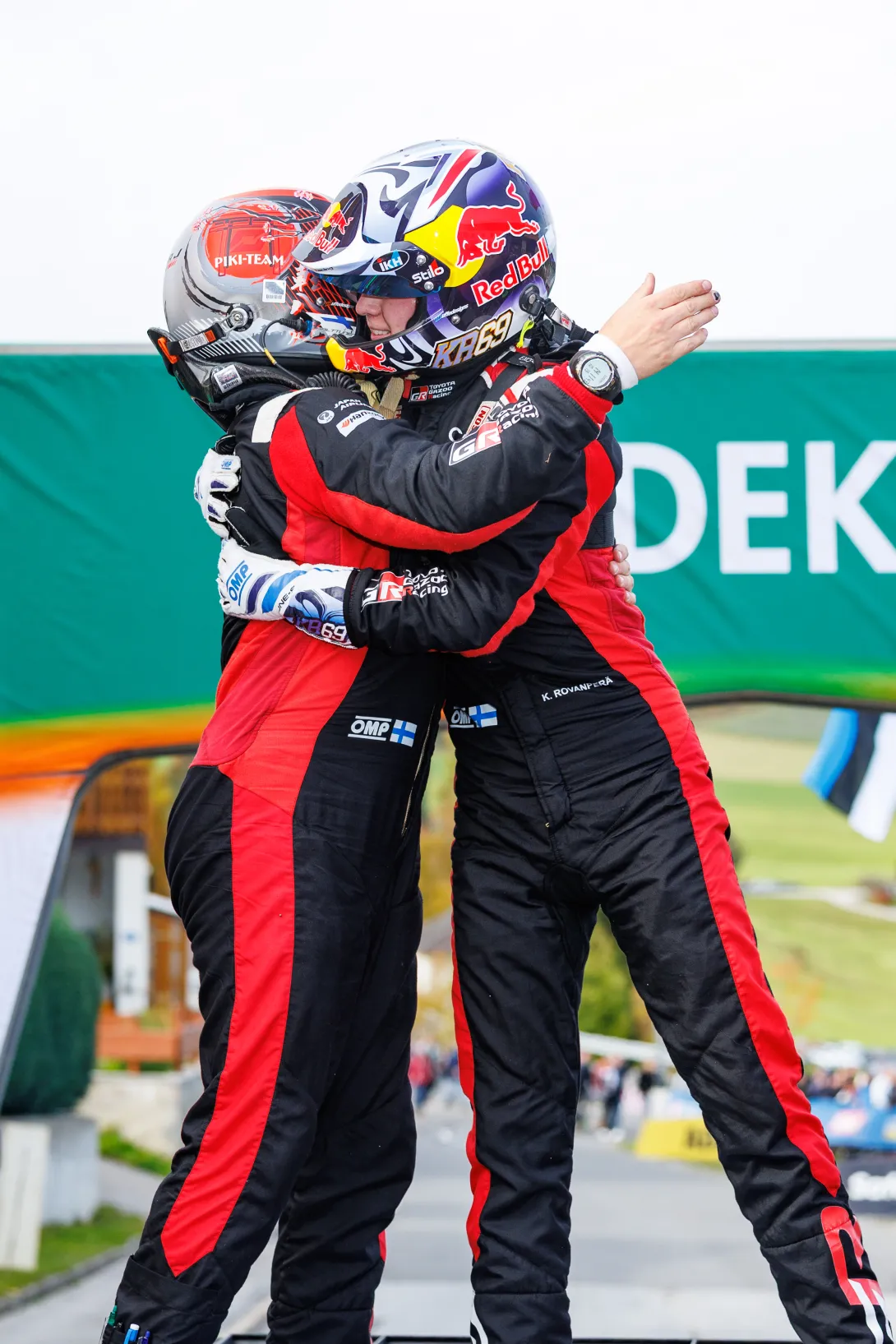 Kalle Rovanperä ja Jonne Halttunen hyppäsivät auton katolle Keski-Euroopan rallin voiton kunniaksi.